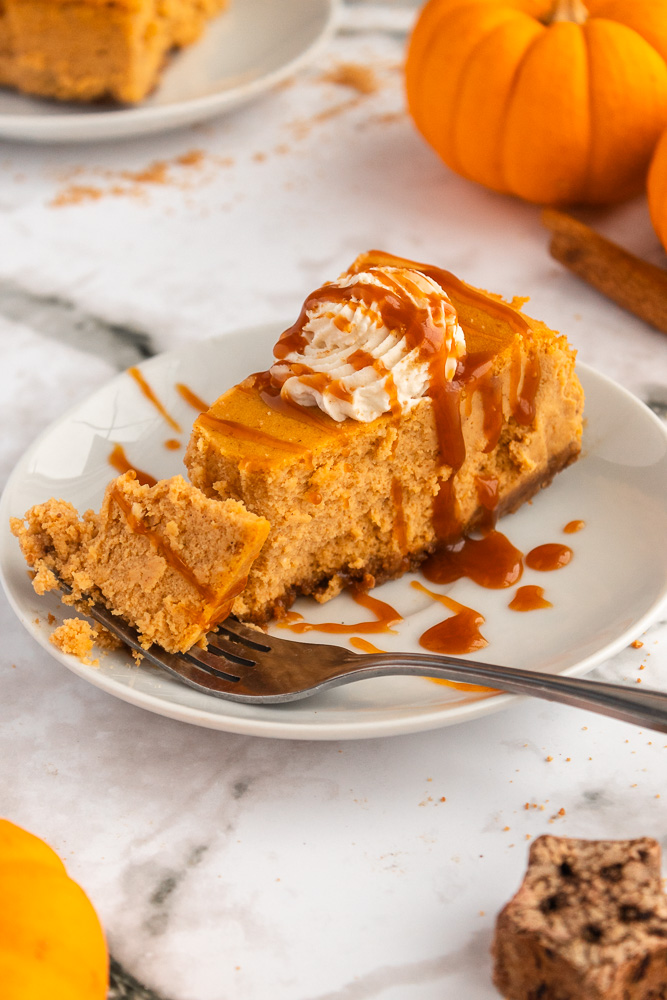 This pumpkin cheesecake is incredibly easy and delicious on its own, but add a drizzle of chai caramel sauce and a dollop of whipped cream, and it becomes downright show-stopping.